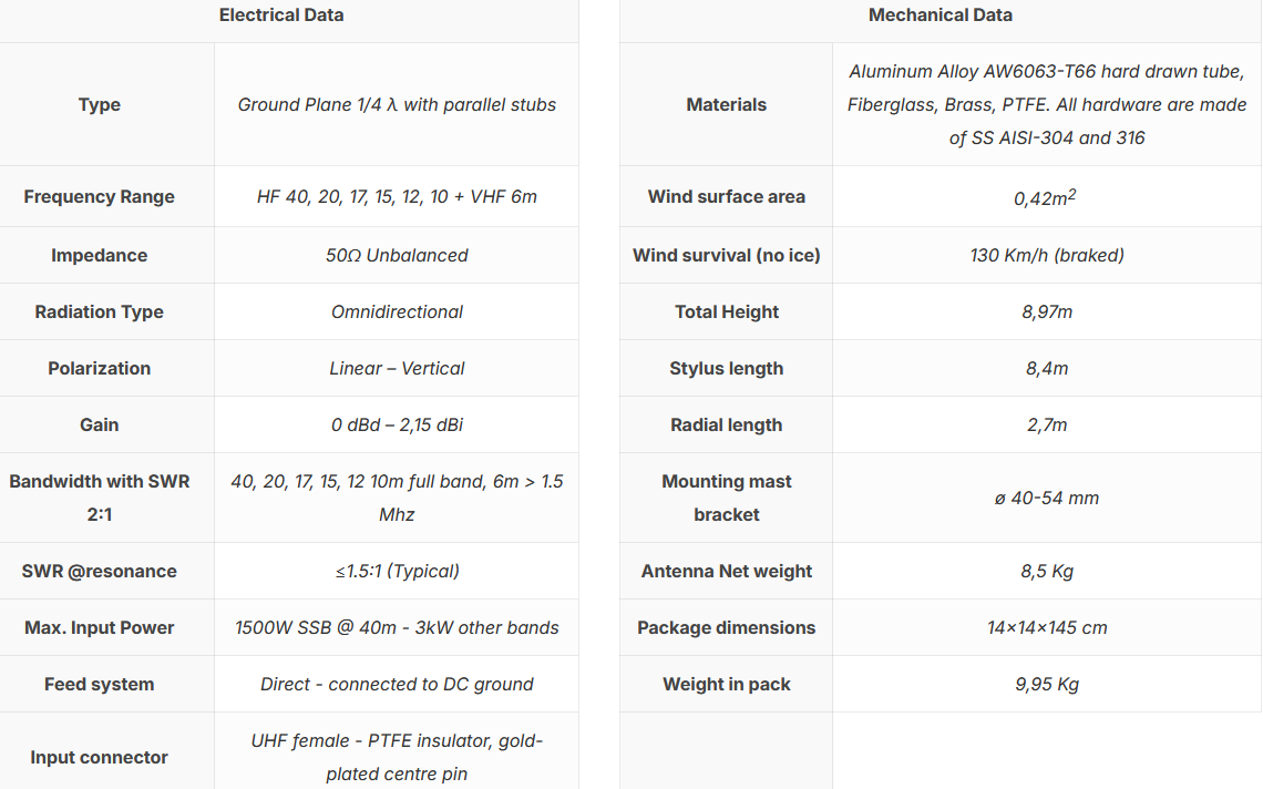 Vertical multiband 1/4 λ Ground Plane base-fed antenna for the following HAM bands: 40, 20, 17, 15, 12, 10 and 6m.